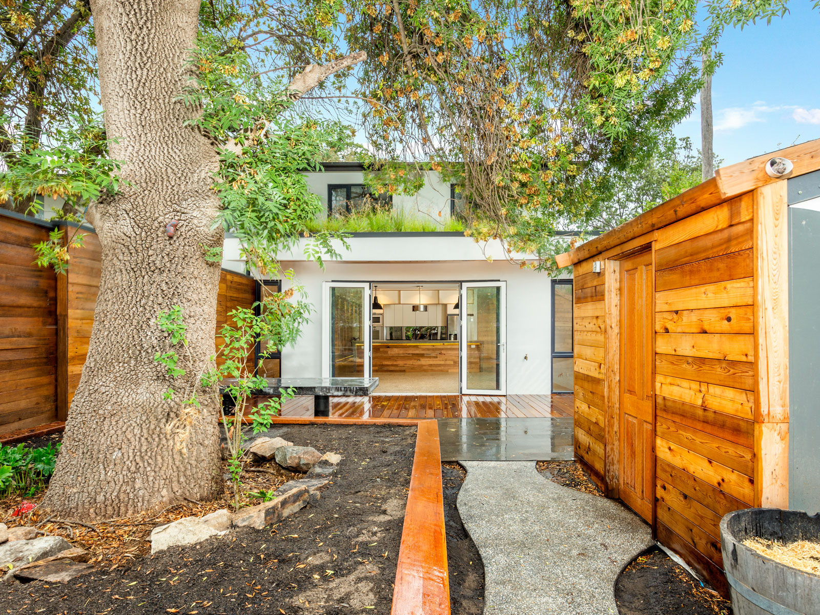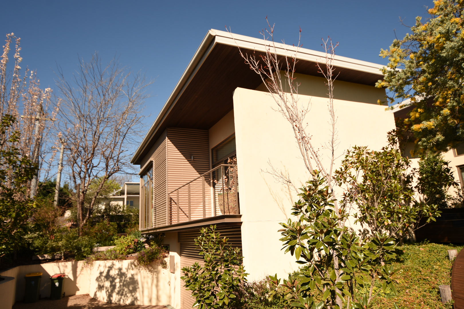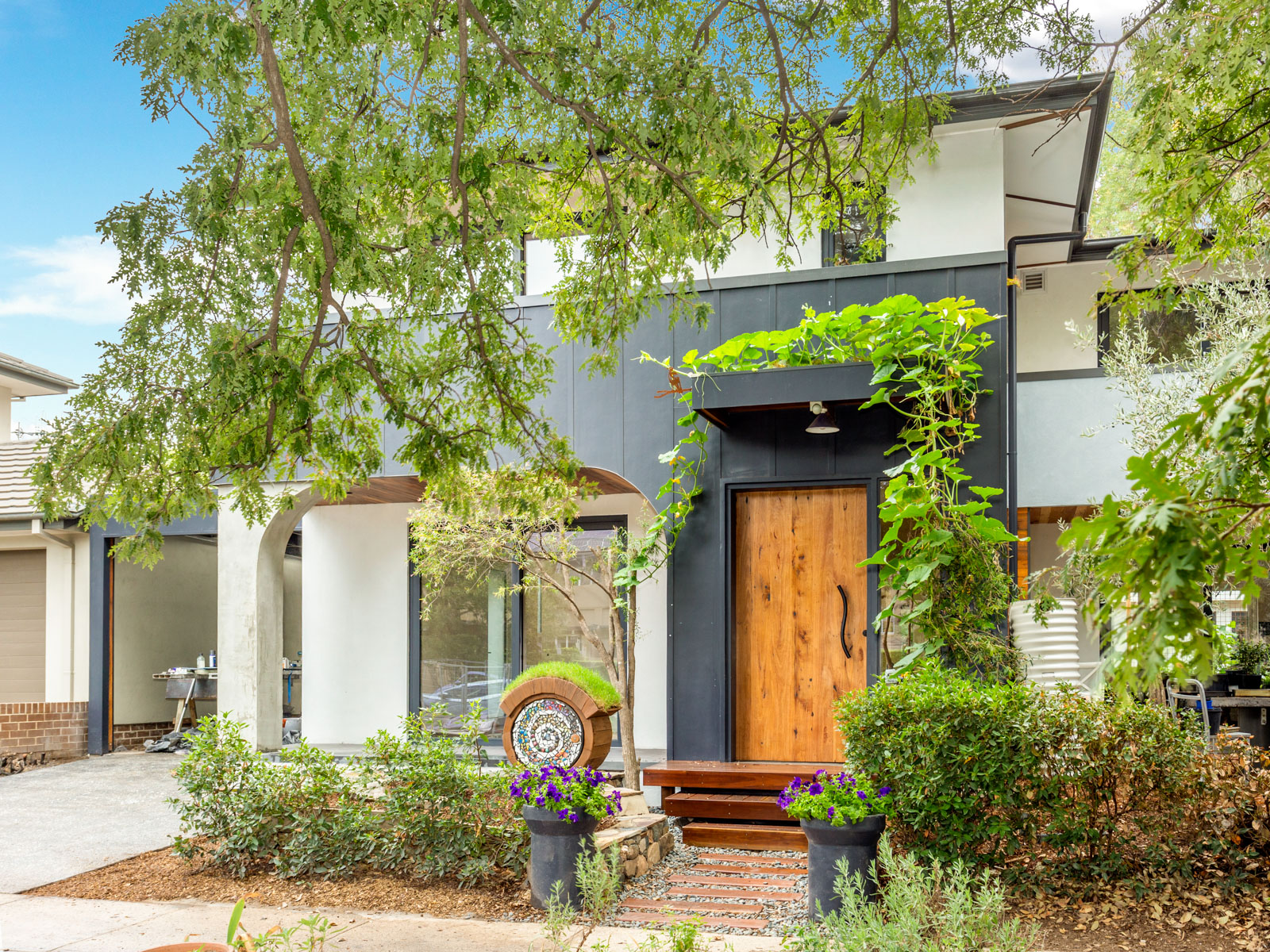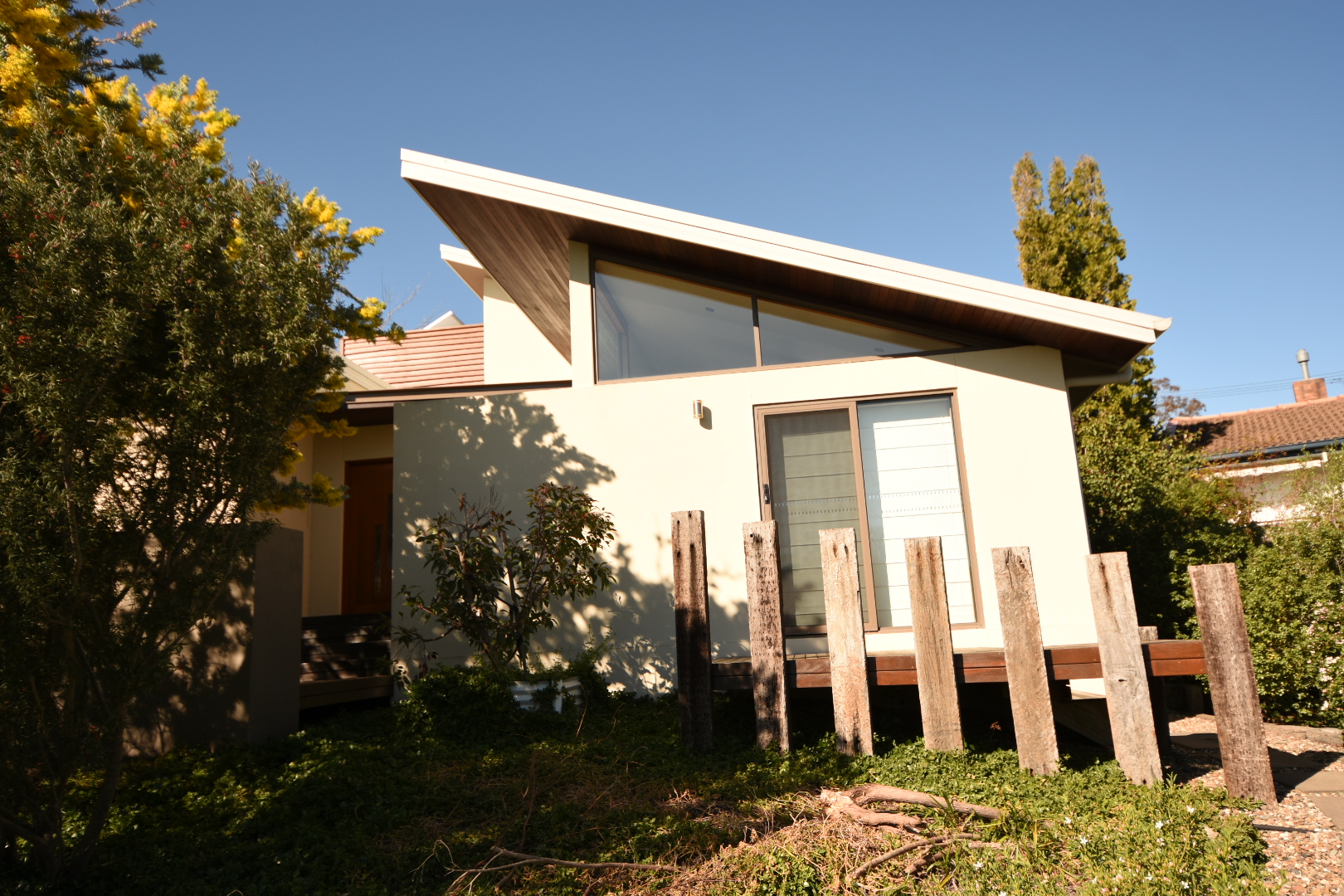 A modern eco-oasis in the heart of Canberra. This house has two green roofs and a unique architectural design. The house features extensive recycled timber, including the front door, a timber corridor feature wall and floor boards.