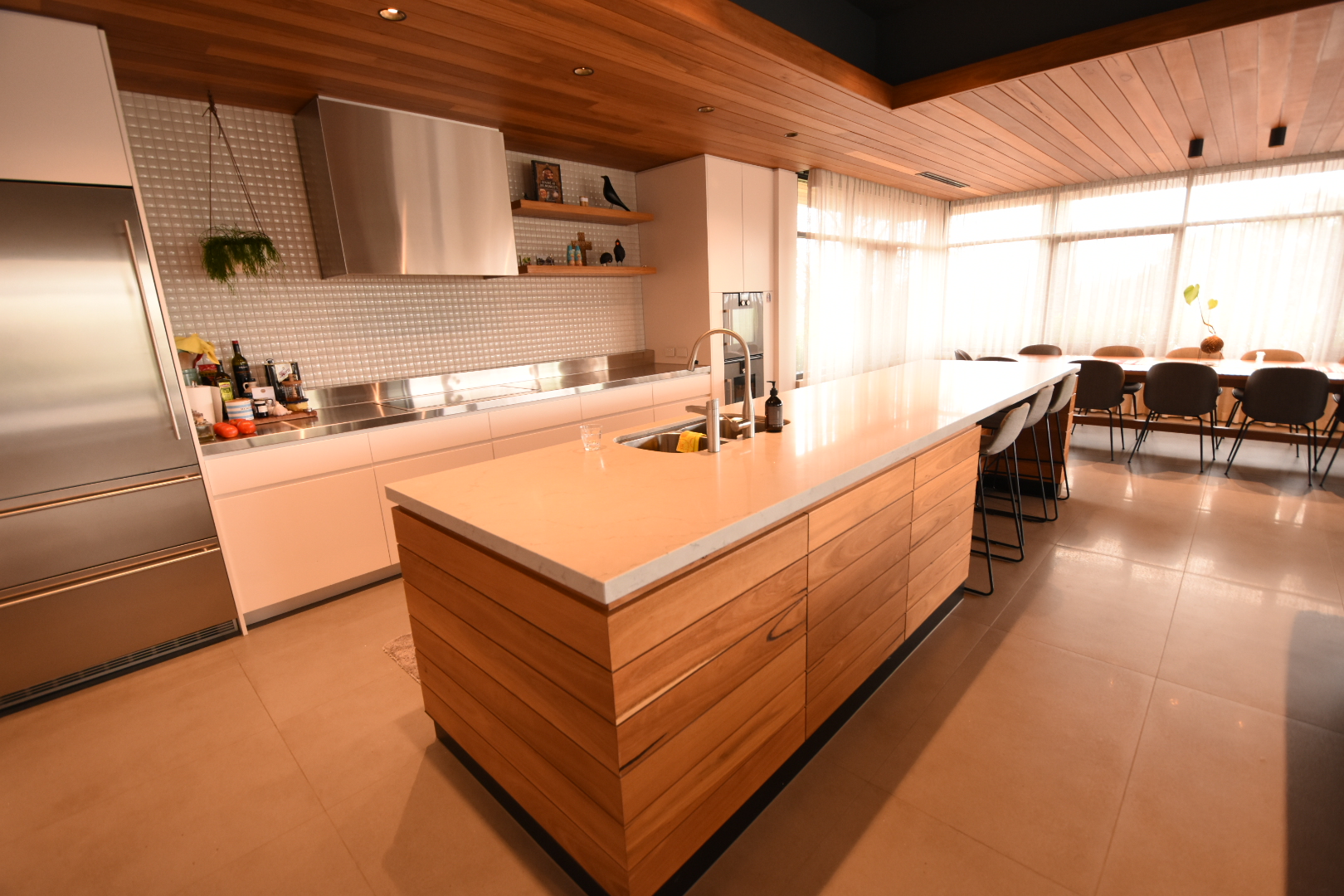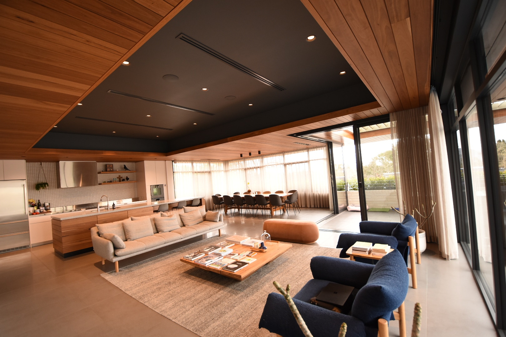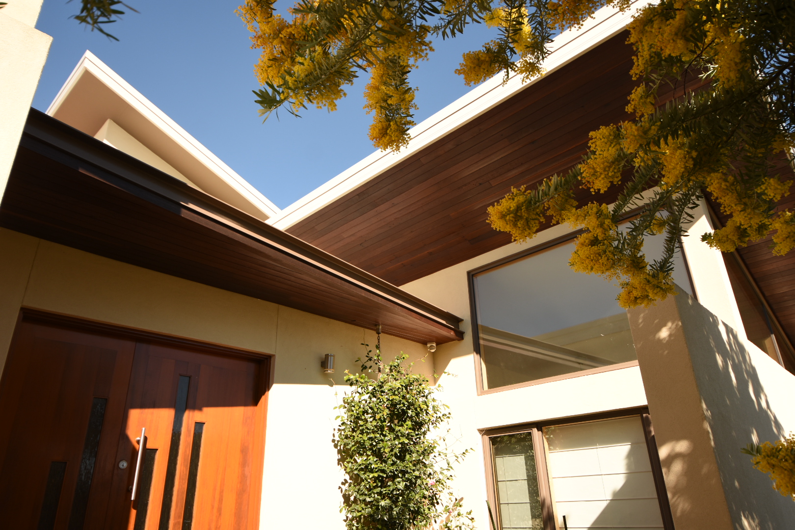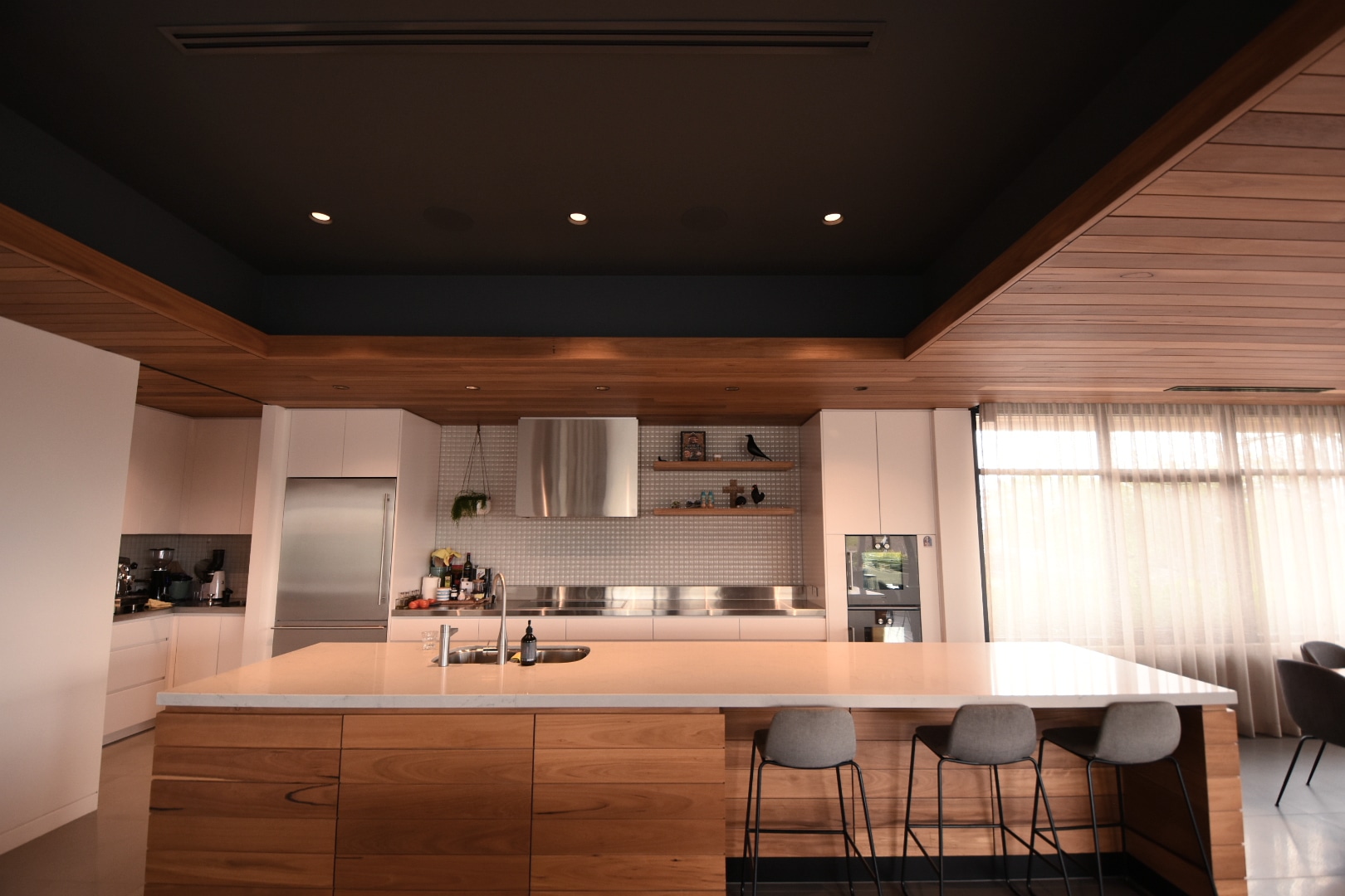 We built this sleek architectural home in leafy Deakin, Canberra. This house is unique for its timber cladded ceilings, which flow throughout the entire home. It includes a large living area, pool, sauna and indoor gym.